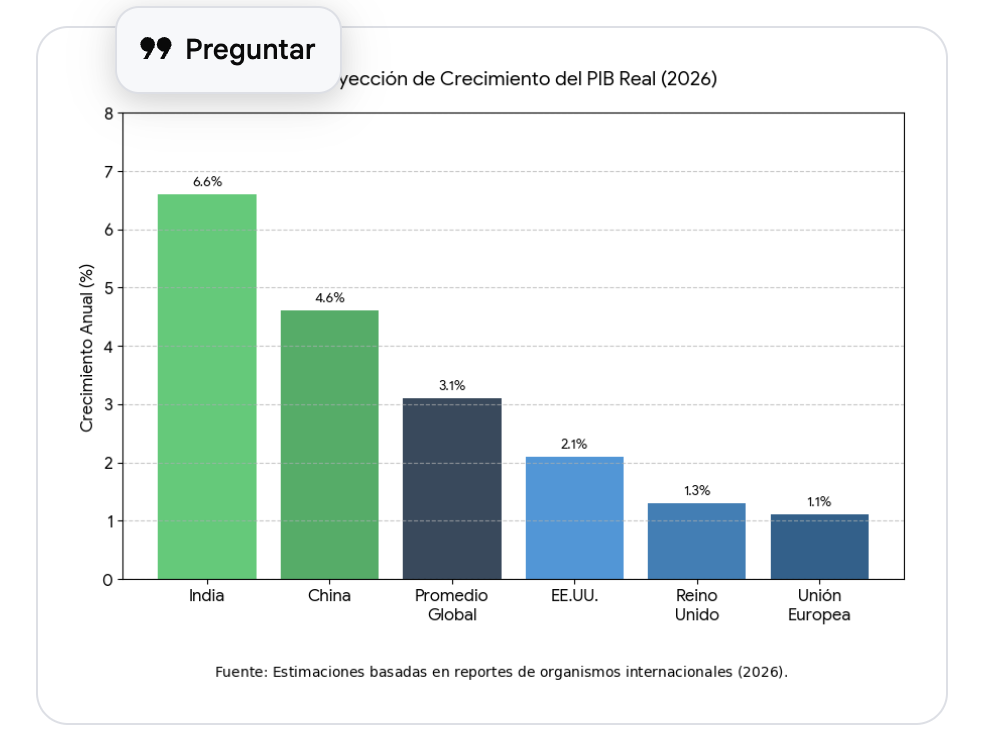 • India: La Nueva Potencia: En 2026, India consolidará un crecimiento del 6,6%. Se espera que supere a Japón para convertirse en la cuarta economía más grande del mundo, atrayendo capital que anteriormente fluía hacia China.